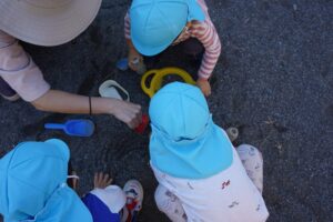 キレイな形になるように、乾いた砂を掘って少し湿った砂をかき集めているところです。