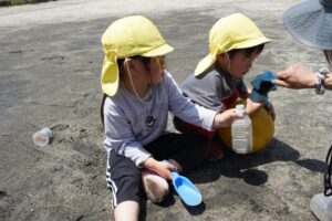 容器に砂を集めて“シャカシャカ”と音を楽しむ2歳児さん