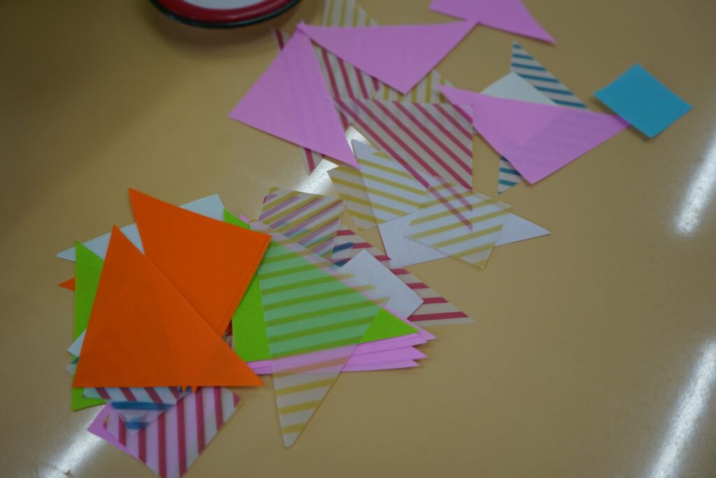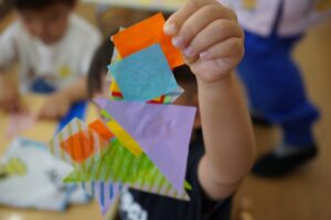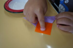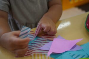 のりの感触を楽しみながら、七夕飾りをつくるこどもたち
