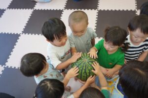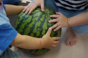すいか割りの前に、まずはみんなでスイカを触ってみましたよ!