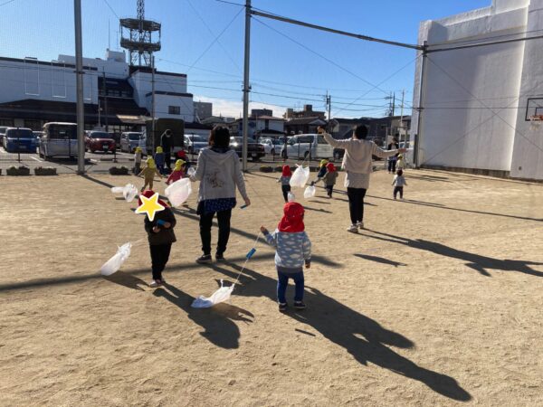 お正月遊びの一環で、凧を作りました! ビニール袋に、それぞれ好きな色でぐるぐる… タコ糸をつけて完成! ベテルギウスで凧揚げをしました! たくさん走り回り、凧が浮き上がると嬉しそうな子どもたちでした♪