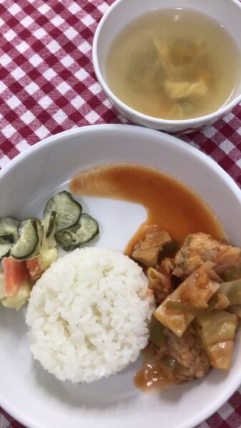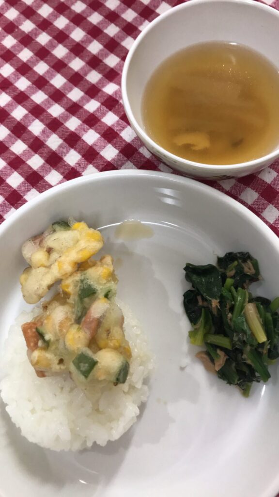 これは、定番の人気メニューですが、初めて作った時は驚きました。大豆の水煮、魚肉ソーセージが入り、ピーマン、コーンが入る事で彩り鮮やか❣️栄養満点で、保育園のメニューって考えられていて凄いと感動したものです。‥で、今日も良く食べてくれました。煮浸しも、好き好きありますが、意外に陰ながらサブ好みの子もいて好評です。????
