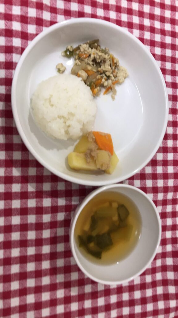 かみなり豆腐とツナじゃが 2020年10月1日 最終更新日時 : 2020年10月1日 ななせ先生 今日のかみなり豆腐は、ゴボウ、ピーマンなどいろいろな野菜の味の楽しめる一品です。少し煮汁を残して、ご飯にかけて食べる事おすすめしたら、みんな良く食べました。????