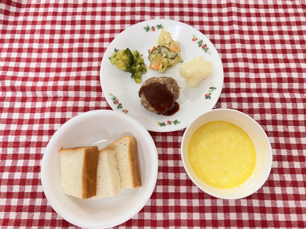 ハンバーグ 2024年2月22日 最終更新日時 : 2024年2月22日 ななせ先生 今日のお給食は ハンバーグ マッシュポテト ブロッコリーのスープ煮 ツナマヨサラダ かぼちゃスープ 食パン でした✨️