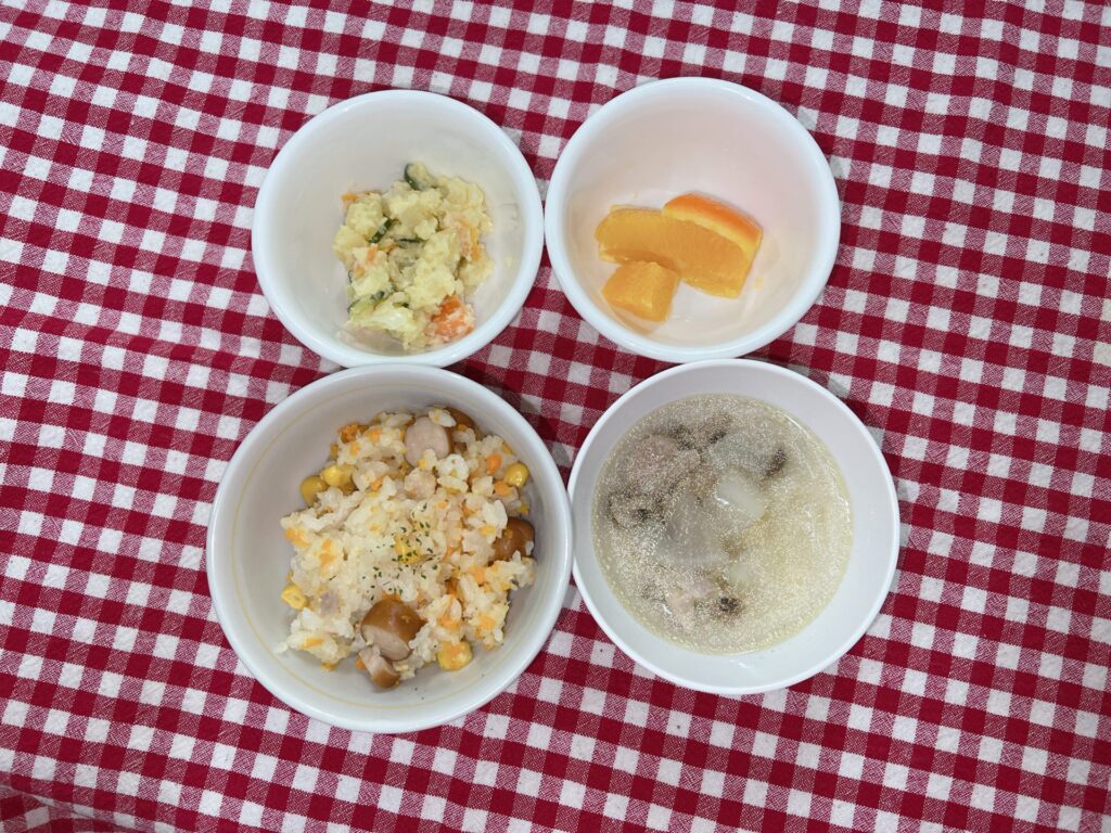 今日のお給食は ピラフ ポテトサラダ 鶏肉とキノコのスープ オレンジ でした✨️