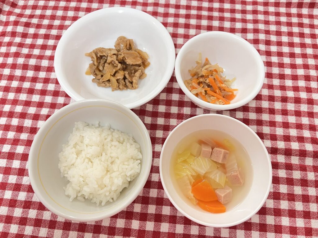 今日のお給食は ポークケチャップ もやしサラダ 白菜のスープ ご飯 でした✨