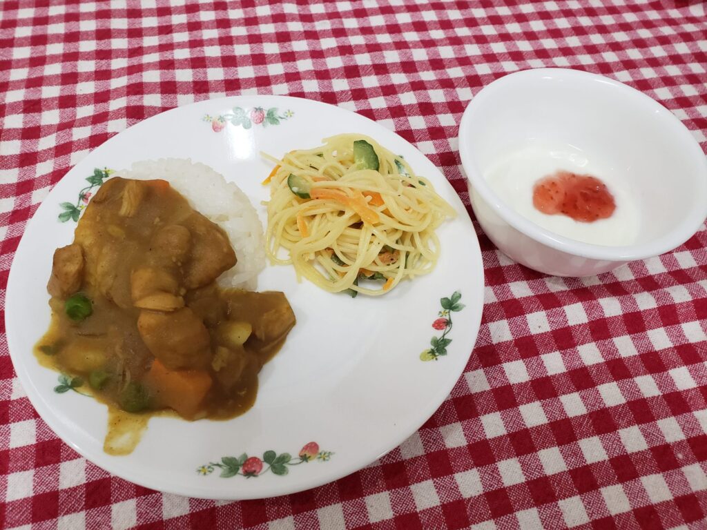今日の給食は、チキンカレーとスパゲッティサラダでした。
