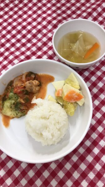 魚肉ソーセージや野菜、コーンも入って人気メニューです。小松菜の煮浸しは、好みが分かれます????