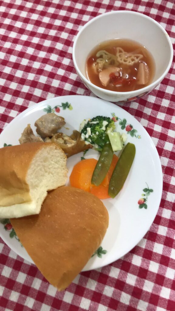 昨日は、クリスマス会????サンタさんも登場して、子どもたちは少々緊張気味でした????メニューは、チキンの照り焼きと人参グラッセ、ブロッコリーのサラダ????そしてグラムハウスのコッペパンをお腹いっぱい食べました♪????