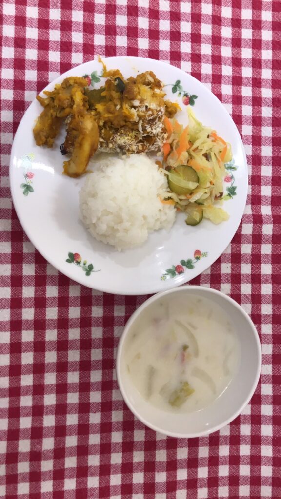 今日のメニューは、カボチャコロッケにチーズ、キャベツサラダにレーズンが入り、カルシウムや鉄分補給も考えて、新生メニューでした。でも、カボチャがイマイチだったようで、チーズをほじって食べてる子がけっこういたようです。少しずつ、成長とともに 好き嫌いもはっきりして来ました。????