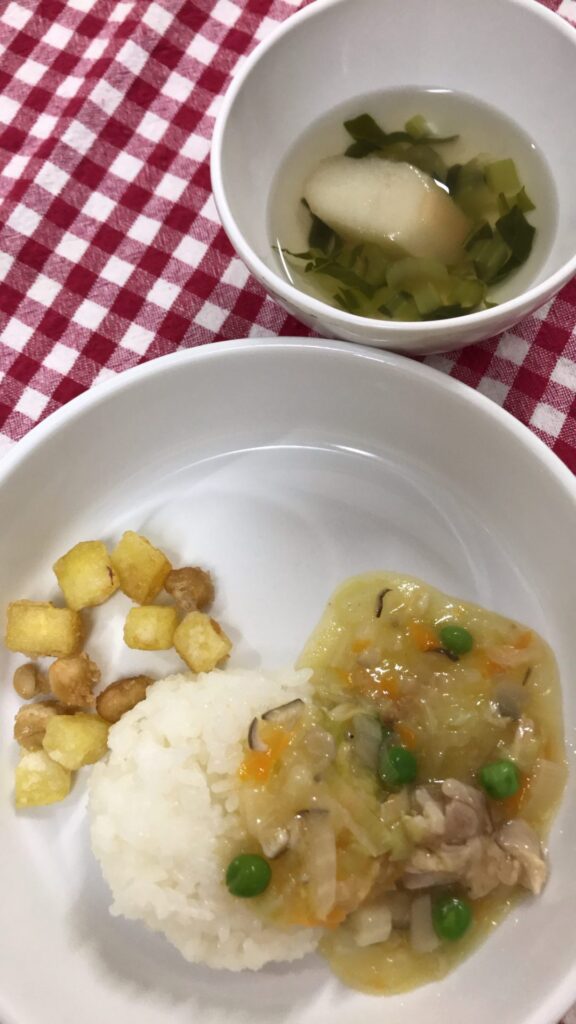 これは、きっとこの先定番の人気メニューになるはずですが、まだ始めて間もない新入園のうみそらさん方には未知との遭遇だったかな?保育園のメニューはバリエーション豊かなので、いろいろ食べて好きな給食が出来ること願っています♪