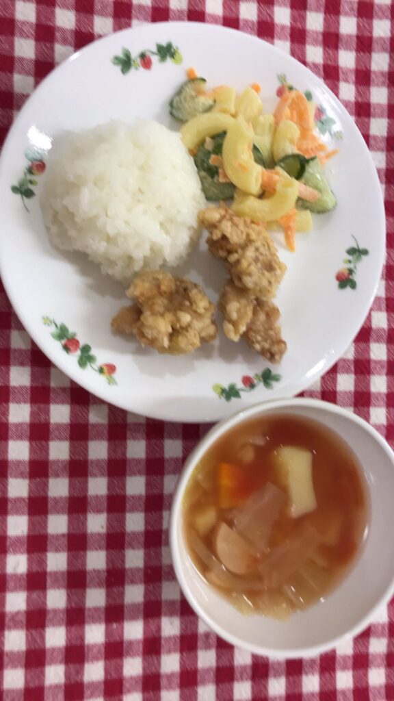 今日はすっかり秋模様の天気。雨が降るので室内で遊んでいたお友だち。真夏の暑さ負けからは脱出したようで、食欲は戻りつつあります。????唐揚げはもちろん、具沢山の野菜スープもマカロニ、これはリンゴのスライス入りで、おかわりいっぱいしてくれました。????