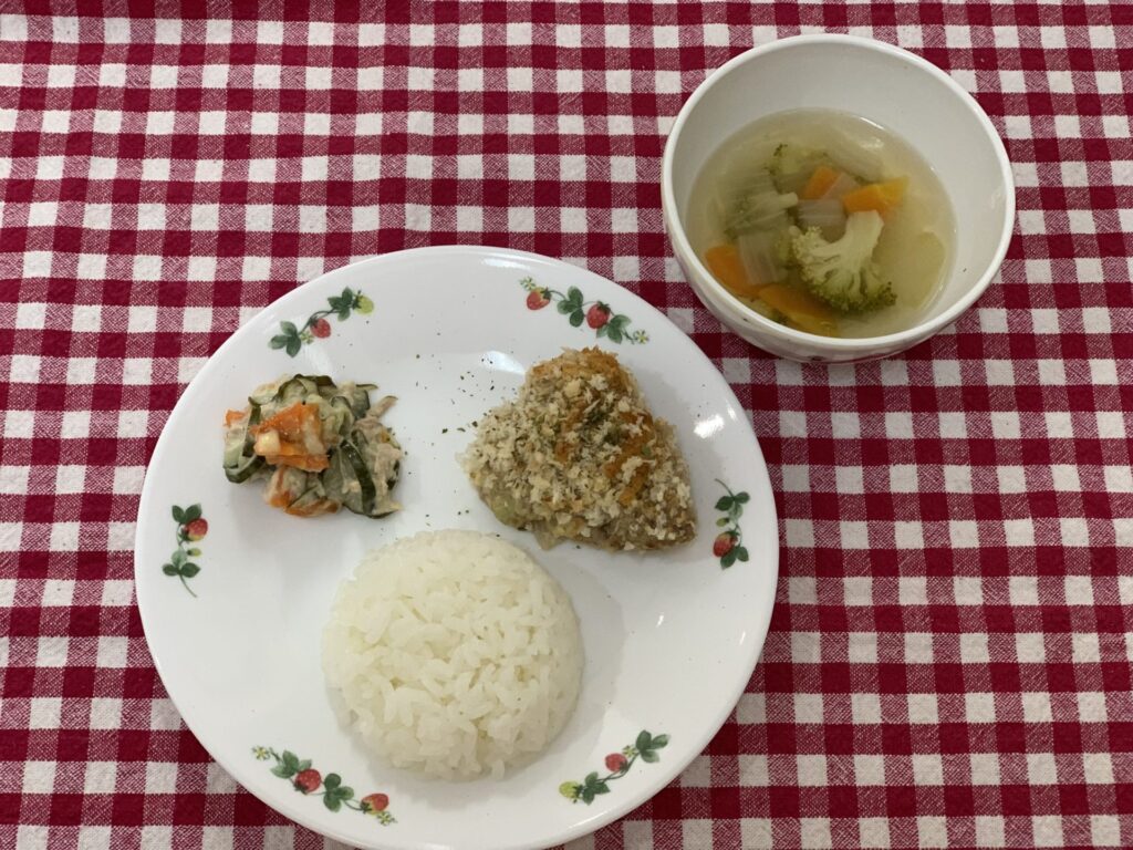 スコップメンチカツ ツナサラダ 野菜スープ ご飯