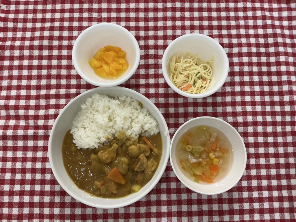 チキンカレー 2025年11月10日 最終更新日時 : 2025年11月14日 ななせ園長 今日は子どもたちの好きなメニューの定番ともいえる“カレーライス”でした! ●スパゲティサラダ ●白菜コーンスープ ●フルーツポンチどれもモリモリよく食べていました😊