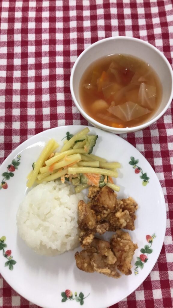 今日は、外出時に地震があったと想定した訓練があったので、みんな早めのご帰還でした。気温差も激しく、鼻垂らしの子やお休みも多く 少し活気が少なかったかな?でも、具沢山スープはたくさんおかわりしてくれました。????