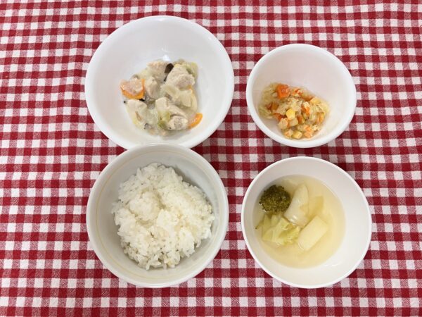今日のお給食は 鶏肉のクリーム煮 コールスローサラダ 野菜スープ ご飯 でした✨️