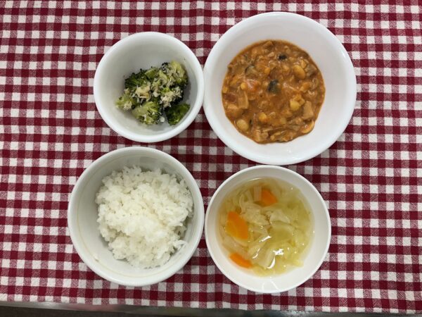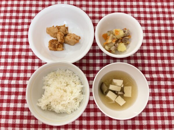 今日のお給食は 甘辛ジューシーチキン そぼろ煮 とろみスープ ご飯 でした✨️