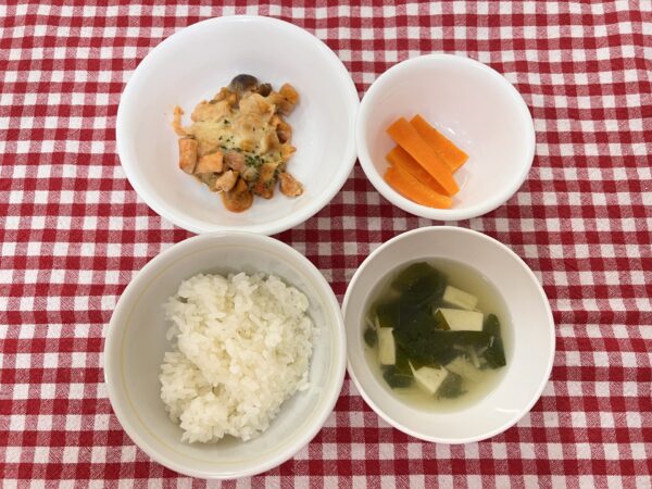 今日のお給食は 鶏肉のトマトチーズ焼き 人参甘煮 モロヘイヤスープ ご飯 でした✨