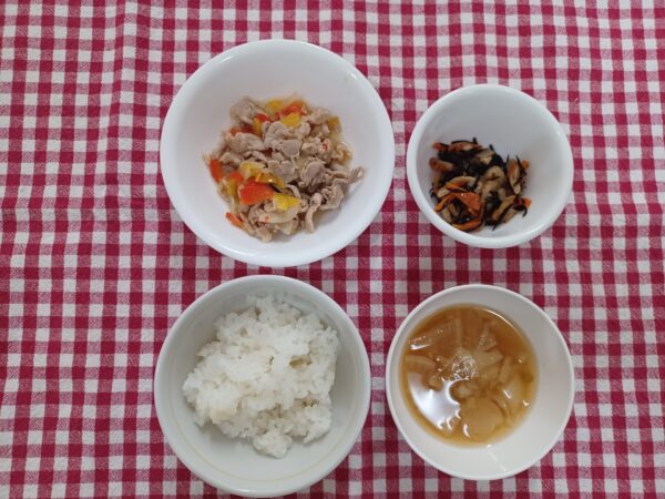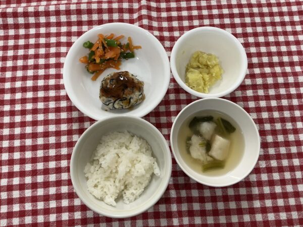 今日のお給食は 肉豆腐風 ツナ和え 和風スープ ご飯 でした✨