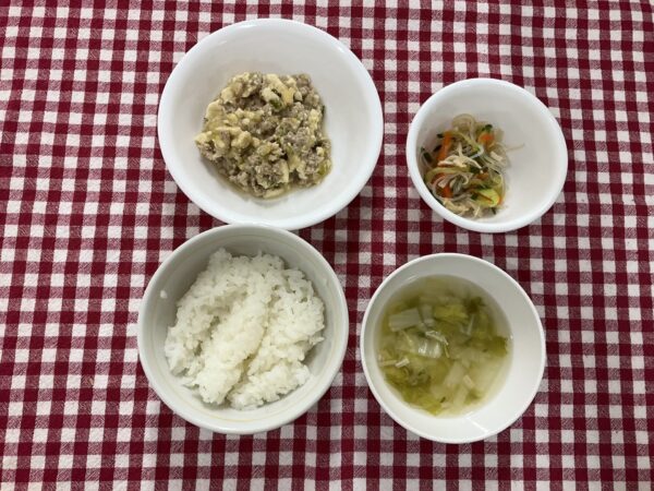 今日のお給食は 甘辛ジューシーチキン そぼろ煮 とろみスープ ご飯 でした✨️