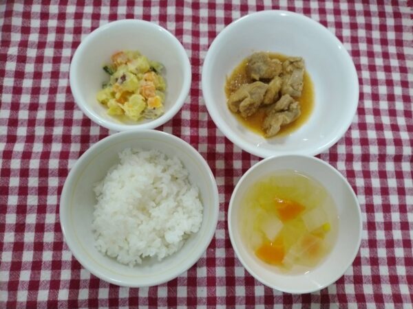 今日のお給食は 鶏の照り焼き 春雨サラダ マッシュポテト スープ ご飯 でした✨