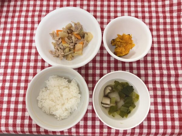 今日のお給食は 肉野菜炒め かぼちゃのいとこ煮 すまし汁 ご飯 でした✨