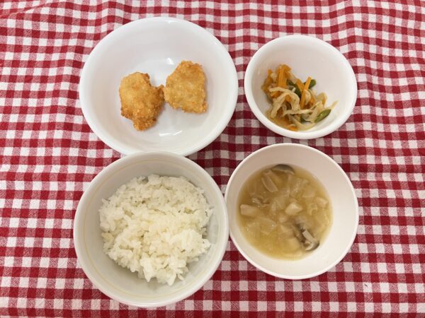 今日のお給食は 鶏の唐揚げ ひじきの煮物 お味噌 ご飯 でした✨️