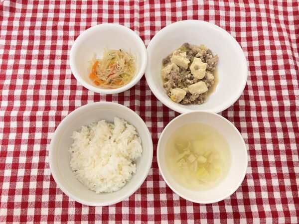 今日のお給食は 麻婆豆腐 春雨サラダ 中華スープ ご飯 でした✨️