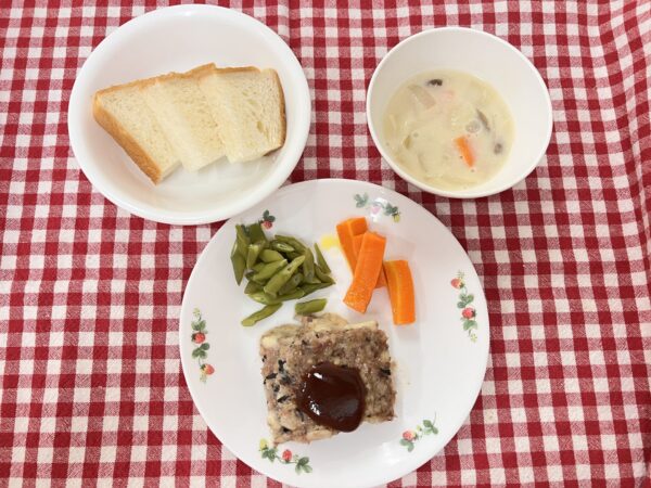 今日のお給食は ひじき入りハンバーグ いんげんソテー にんじん甘煮 豆乳スープ 食パン でした✨