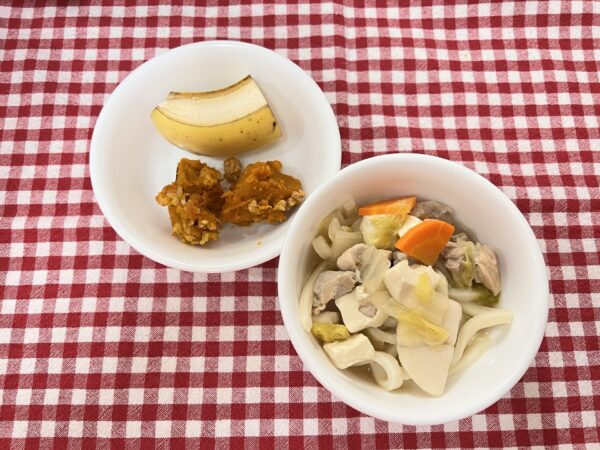 今日のお給食は けんちんうどん かぼちゃのそぼろ煮 バナナ でした✨️