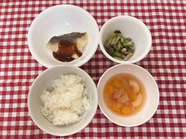 今日のお給食は 鮭の味噌マヨネーズ焼き かぼちゃのいとこ煮 豆乳入り豚汁 ご飯 でした✨️
