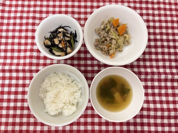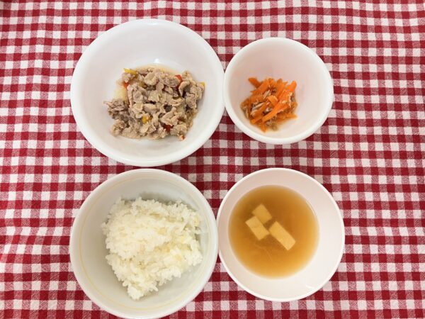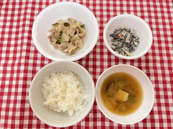 今日のお給食は 生姜焼き ひじきの炒め煮 お味噌汁 ご飯 でした✨️