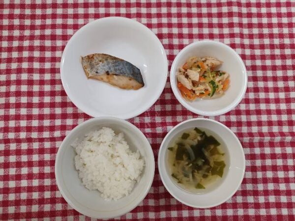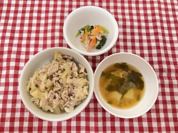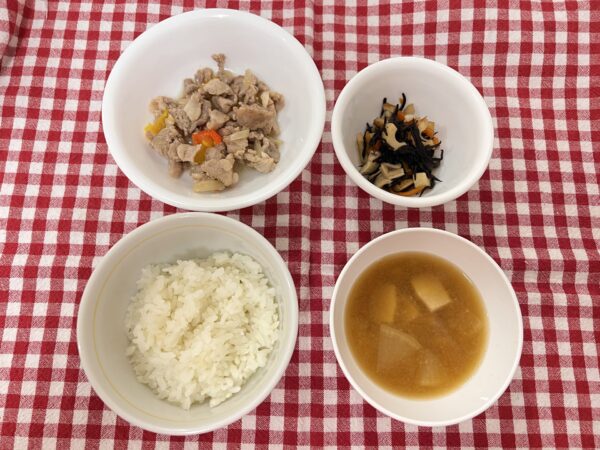 今日のお給食は 大根と豚肉の煮物 ひじきサラダ お味噌汁 ご飯 でした✨