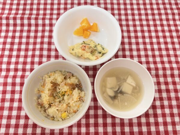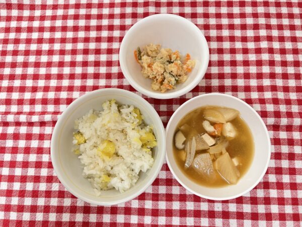 今日のお給食は さつまいもご飯 おからの炒り煮 具沢山汁 でした✨️