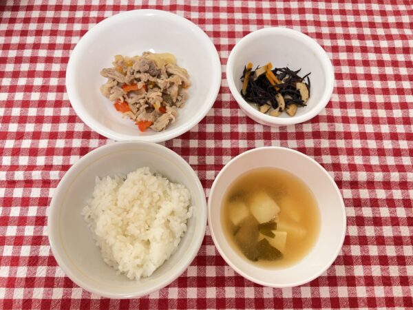 今日のお給食は 生姜焼き ひじきの炒め煮 お味噌汁 ご飯 でした✨️