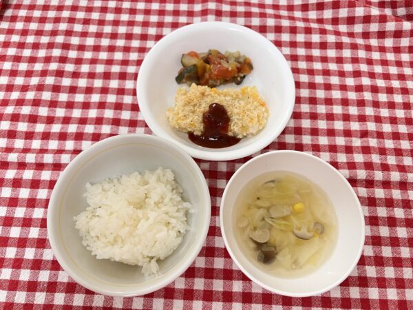 今日のお給食は スコップコロッケ ラタトゥイユ コンソメスープ ご飯 でした✨️