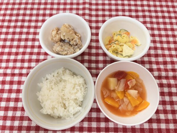 今日のお給食は 唐揚げ マカロニサラダ トマトスープ ご飯 でした✨️