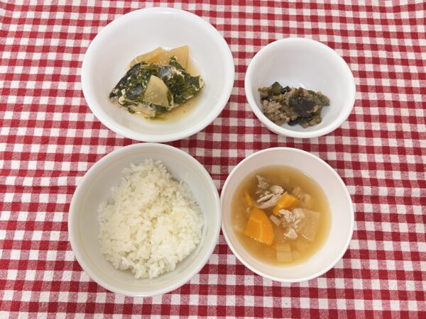 今日のお給食は 煮魚 なすのそぼろ煮 豚汁 ご飯 でした✨️