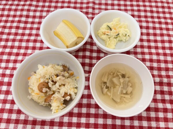 今日のお給食は ピラフ ポテトサラダ キノコスープ バナナ でした✨️