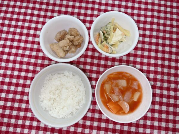 今日のお給食は 鶏肉の唐揚げ マカロニサラダ トマトスープ ご飯 でした✨ 今日も沢山食べてくれましたᙏ̤̫͚♡ 唐揚げはとにかく大好評。 マカロニサラダはりんごが入っており、りんごりんご!という子もいました♡