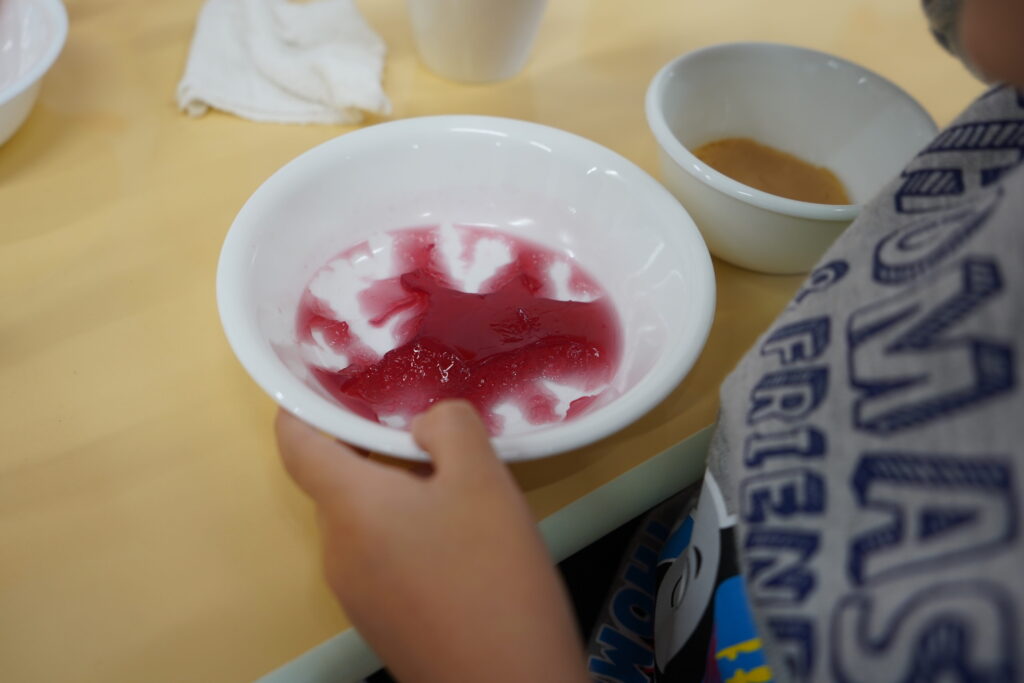 実はこれ、調理職員さんの「おやつの時間を宝探しみたいに楽しんでほしい!」という素敵なアイデアから生まれた「宝探しゼリー」なんです!