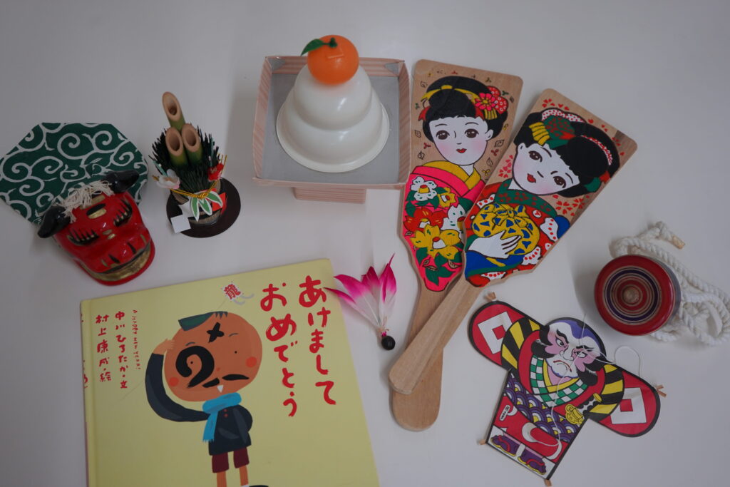 園では子どもたちに、鏡餅や門松、羽子板、コマなど、